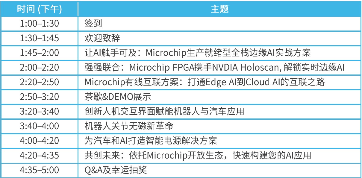 当前,边缘AI正从技术探索走向规模化量产,实时算力、高效互联、可靠电源、开放生态已成为工业、机器人与汽车智能化升级的核心驱动力。诚挚邀请您参加即将在重庆举办的“Microchip 2026让AI触手可及技术研讨会”,与行业专家、生态伙伴及技术同仁共同探讨边缘AI全栈落地之道。